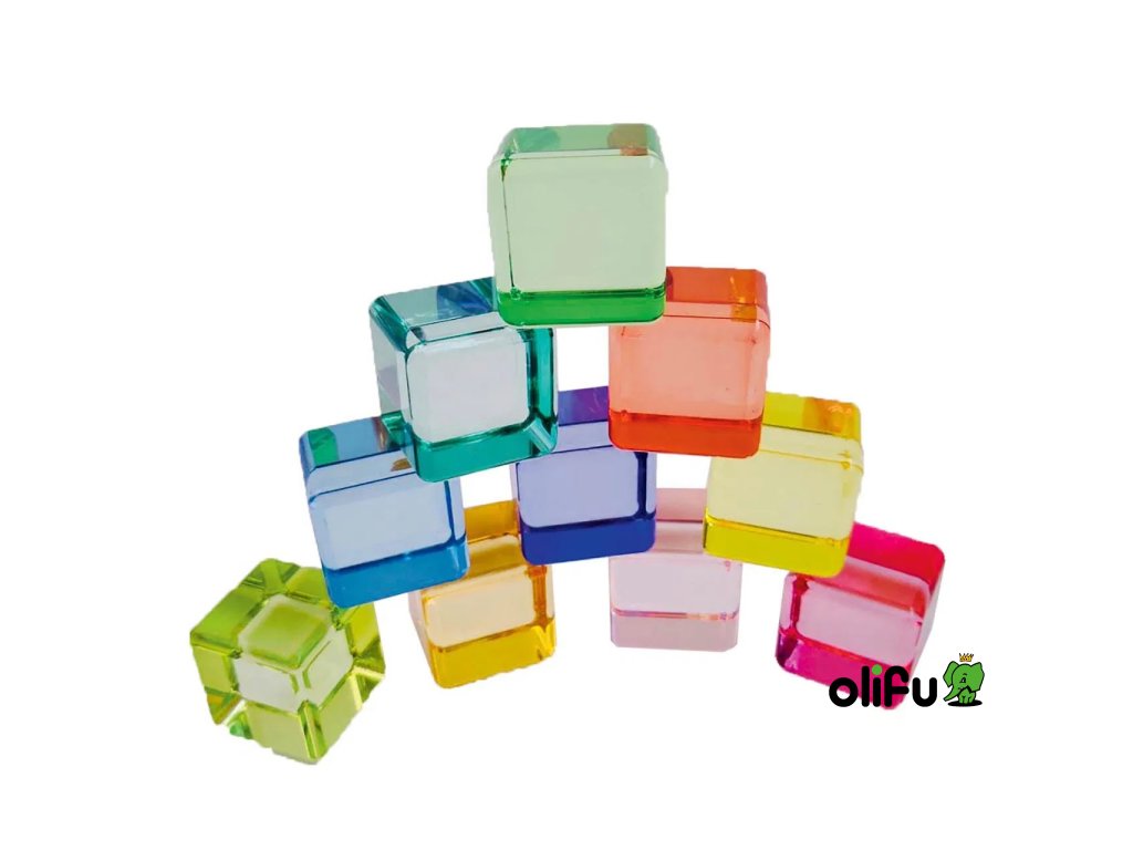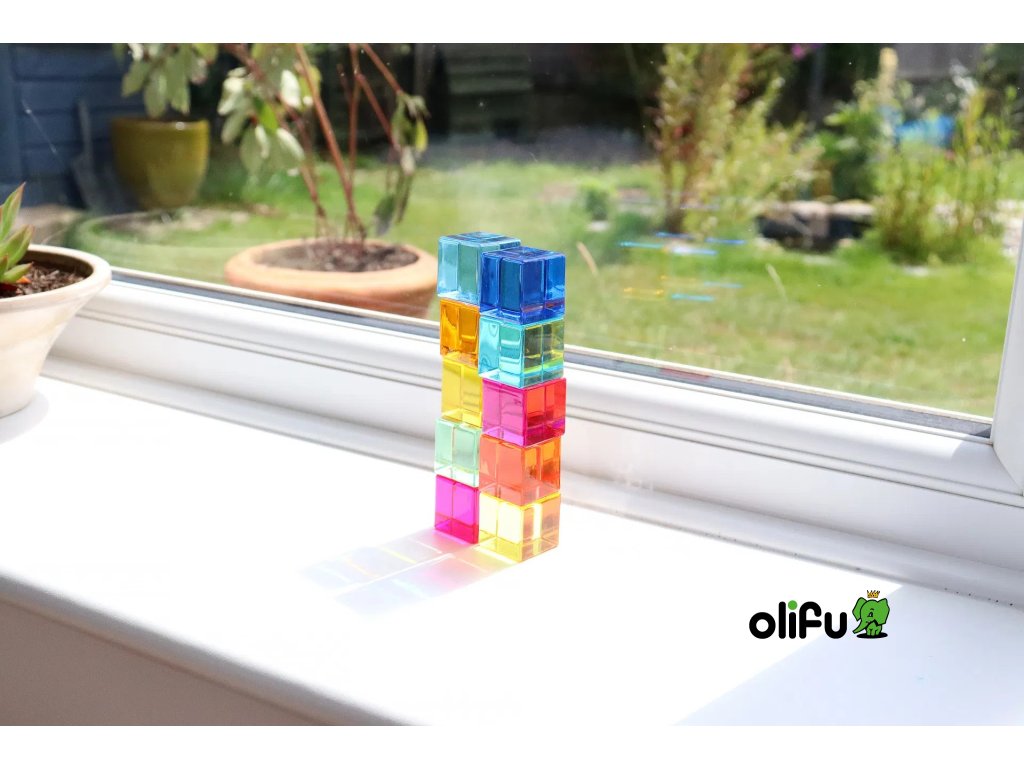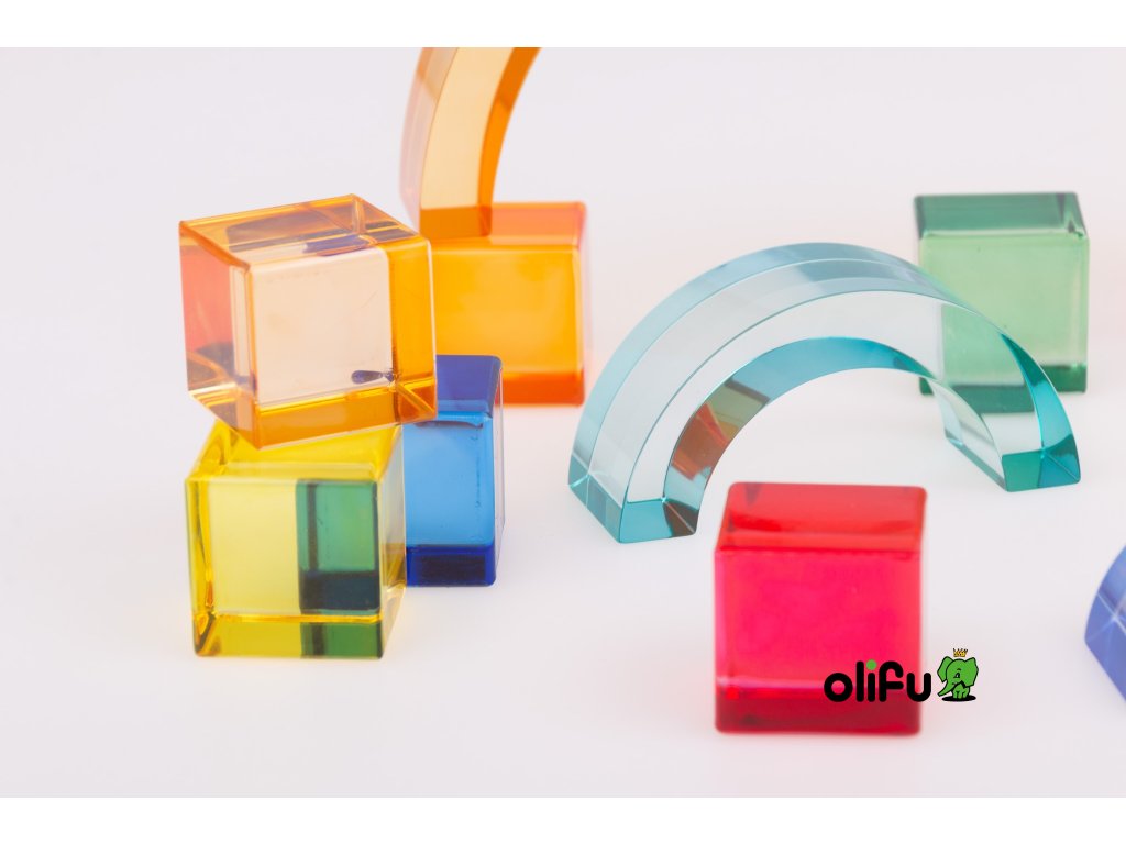 Tyto všestranné kostky v 10 různých barvách jsou vhodné nejen pro stavění, ale také pro ilustraci teorie barev, čísel a množství a hravou formou povzbuzují k počítání v číselném rozsahu až do 100. Jejich průsvitnost je navíc ideální pro použití na světelných stolech nebo světelných boxech.